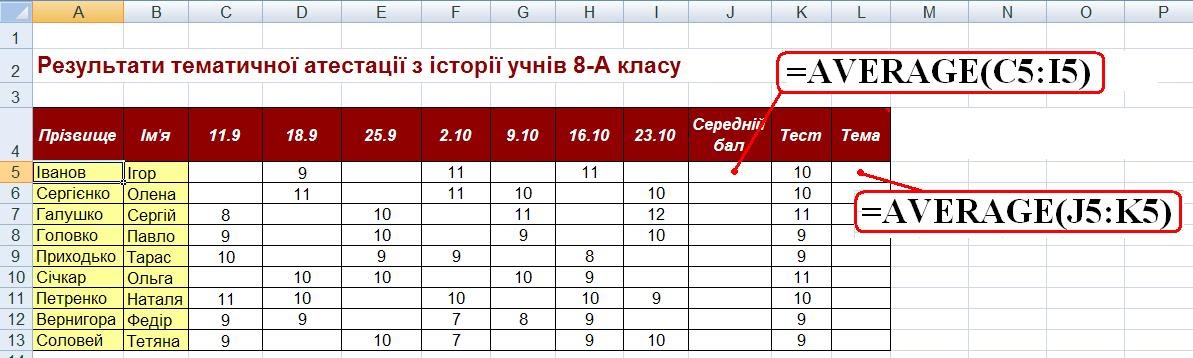 2) У стовпці Е за допомогою відповідних функцій обчисліть підсумкові оцінки учнів як середнє арифметичне поточних оцінок,