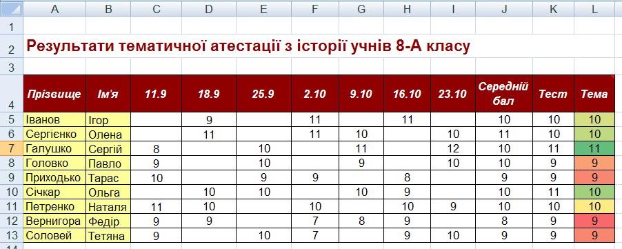 Застосуйте умовне форматування до відповідного діапазону клітинок так, щоб високі результати (10–12 балів) відображалися на зеленому тлі, достатні (7–9 балів) — на жовтому, усі інші — на рожевому.