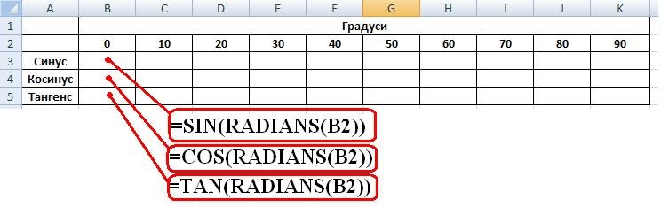 Створіть таблицю, що містить значення синуса, косинуса й тангенса для кутів 0°, 10°, 20°, 30°, 40°, 50°, 60°, 70°, 80°, 90°. Візьміть до уваги, що аргументами відповідних математичних функцій у середовищі табличного процесора є значення кута в радіанах.