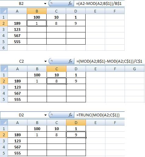 Використовуючи математичні функції знаходження остачі від ділення та відкидання дробової частини числа, складіть у табличному процесорі таблицю для визначення цифр заданого тризначного числа, як показано на прикладі.