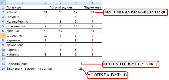 3) У довільній комірці під прізвищами за допомогою функції COUNTIF(СЧЕТЕСЛИ) розрахуйте, скільки учнів мають під-