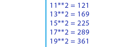 Виведемо квадрати непарних чисел з проміжку від 11 до 19.