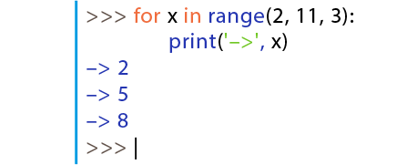 Виклик range(2, 11, 3) надає змінній х значення від 2 до (11–1) із кроком 3, тому, хоча 8 + 3 = 11, значення 11 до послідовності значень не входить.